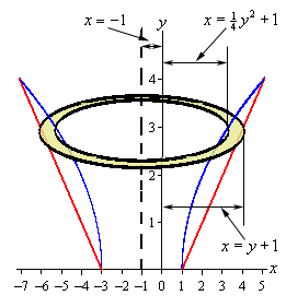 \[\begin{align*}{\mbox{outer radius}} & = y + 1 + 1 = y + 2\\ {\mbox{inner radius}} & = \frac{{{y^2}}}{4} + 1 + 1 = \frac{{{y^2}}}{4} + 2\end{align*}\]The cross-sectional area is then,