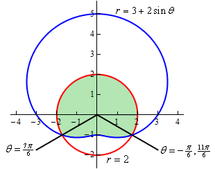 \[\begin{align*}A & = \int_{{\,\frac{{7\pi }}{6}}}^{{\,\frac{{11\pi }}{6}}}{{\frac{1}{2}\left( {{{\left( 2 \right)}^2} - {{\left( {3 + 2\sin \theta } \right)}^2}} \right)\,d\theta }}\\ & = \int_{{\,\frac{{7\pi }}{6}}}^{{\,\frac{{11\pi }}{6}}}{{\frac{1}{2}\left( { - 5 - 12\sin \theta - 4{{\sin }^2}\theta } \right)\,d\theta }}\\ & = \int_{{\,\frac{{7\pi }}{6}}}^{{\,\frac{{11\pi }}{6}}}{{\frac{1}{2}\left( { - 7 - 12\sin \theta + 2\cos \left( {2\theta } \right)} \right)\,d\theta }}\\ & = \left. {\frac{1}{2}\left( { - 7\theta + 12\cos \theta + \sin \left( {2\theta } \right)} \right)} \right|_{\frac{{7\pi }}{6}}^{\frac{{11\pi }}{6}}\\ & = \frac{{11\sqrt 3 }}{2} - \frac{{7\pi }}{3} = 2.196\end{align*}\]Notice that for this area the “outer” and “inner” function were opposite!