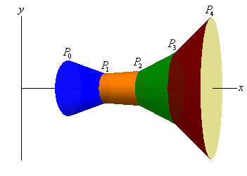The approximation on each interval gives a distinct portion of the solid and to make this clear each portion is colored differently. Each of these portions are called frustums and we know how to find the surface area of frustums.