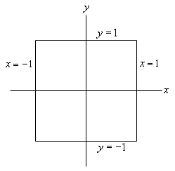\[\begin{align*}&{\mbox{right side :}}\hspace{0.25in}x = 1,\,\, - 1 \le y \le 1\\ & {\mbox{left side :}}\hspace{0.25in}x = - 1,\,\, - 1 \le y \le 1\\ & {\mbox{upper side :}}\hspace{0.25in}y = 1,\,\, - 1 \le x \le 1\\ & {\mbox{lower side :}}\hspace{0.25in}y = - 1,\,\, - 1 \le x \le 1\end{align*}\]These will be important in the second step of our process.