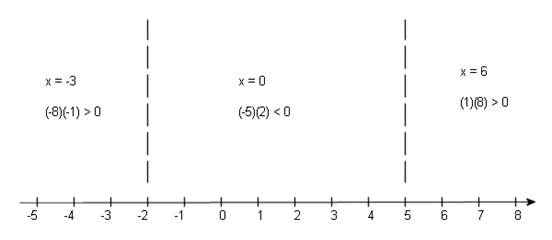 So, that means that these two numbers (\(x = 5\) and \(x = - 2\)) are the ONLY places where the polynomial can change sign. The number line is then divided into three regions. In each region if the inequality is satisfied by one point from that region then it is satisfied for ALL points in that region. If this wasn’t true (i.e it was positive at one point in region and negative at another) then it must also be zero somewhere in that region, but that can’t happen as we’ve already determined all the places where the polynomial can be zero! Likewise, if the inequality isn’t satisfied for some point in that region that it isn’t satisfied for ANY point in that region.