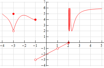 - \(f\left( 0 \right) = - 1\), \(f\left( 9 \right) = 10\), \(\mathop {\lim }\limits_{x \to \,{2^ - }} f\left( x \right) = - 12\), and \(\mathop {\lim }\limits_{x \to \,{2^ + }} f\left( x \right) = - 3\) on the interval \(\left[ {0,9} \right]\).