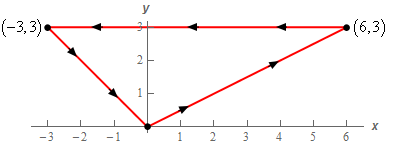 ![There are four parts to this curve. The first part is the portion of $y=x^{2]-3$ starting at (-1,-2) and ending at (1,-2). This is followed by a line starting at (1,-2) and ending at (1,1). The next part is the portion of $y=2-x^{2}$ starting at (1,1) and ending at (-1,1). The final part is a line starting at (-1,1) and ending at (-1,-2).](GreensTheorem_Files/image003.gif)