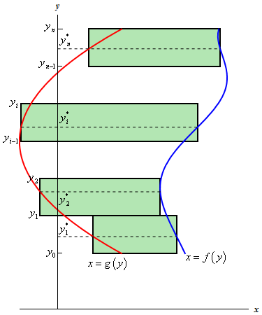 This is the graph of two functions, f(y) and g(y), on the domain c<y<d.  The graph of f(y) is always larger than the graph of g(y).  Along the y-axis are points labeled $y_{0}$, $y_{1}$, $y_{2}$ on the left end $y_{i-1}$,$y_{i}$ in the middle and $y_{n-1}$, $y_{n}$ on the right end.  Between each pair of points is another set of points labeled $y_{1}^{*}$, $y_{2}^{*}$, $y_{3}^{*}$ on the left $y_{i}^{*}$ in the middle and $xy_{n}^{*}$ on the right.  Each of the “*” points are used to get the width of a rectangle along it.  So, there are two rectangles on the bottom, one in the middle and one on the top that are used to represent the area between the two curves.  The left side of each rectangle is on g(x) and the right side is on f(x).