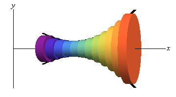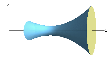 This is the graph of the solid we get from rotating the graph from above about the x-axis.  It looks like an odd vase laying on its side.  It has a wide “mouth” on the right side with a narrower “mouth” on the left side and an even narrow middle that corresponds to the vertex of the parabola from the graph.