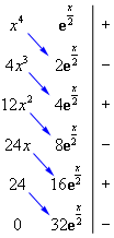 \[\begin{align*}\int{{{x^4}{{\bf{e}}^{\frac{x}{2}}}\,dx}} & = \left( {{x^4}} \right)\left( {2{{\bf{e}}^{\frac{x}{2}}}} \right) - \left( {4{x^3}} \right)\left( {4{{\bf{e}}^{\frac{x}{2}}}} \right) + \left( {12{x^2}} \right)\left( {8{{\bf{e}}^{\frac{x}{2}}}} \right) - \left( {24x} \right)\left( {16{{\bf{e}}^{\frac{x}{2}}}} \right) + \left( {24} \right)\left( {32{{\bf{e}}^{\frac{x}{2}}}} \right)\\ & = 2{x^4}{{\bf{e}}^{\frac{x}{2}}} - 16{x^3}{{\bf{e}}^{\frac{x}{2}}} + 96{x^2}{{\bf{e}}^{\frac{x}{2}}} - 384x{{\bf{e}}^{\frac{x}{2}}} + 768{{\bf{e}}^{\frac{x}{2}}} + c\end{align*}\]We’ve got the integral. This is much easier than writing down all the various \(u\)’s and \(dv\)’s that we’d have to do otherwise.