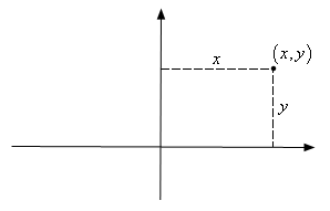 This is a standard xy-axis system with a point (x,y) in the first quadrant.  There is a dashed line dropping straight down from the point to the x-axis and is labeled y to indicate the distance from the point to the x-axis.  There is also a dashed line moving straight left from the point to the y-axis and is labeled x to indicate the distance from the point to the y-axis.