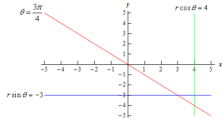 This graph contains all the graphs from this example.  The graph of $\theta =\frac{3\pi }{4}$ goes through the origin and forms a counter clockwise angle of $\frac{3\pi }{4}$ with the positive x-axis.  The graph of $r\cos \theta =4$ is a vertical line going through x=4 on the x-axis.  The graph of $r\sin \theta =-3$ is a horizontal line that goes through y=-3.