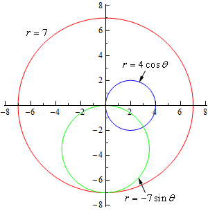 This graph contains all the graphs from this example.  The graph of r=7 is a circle of radius 7 centered at the origin.  The graph of $r=4\cos \theta $ is a circle of radius 2 centered at (2,0). The graph of $r=-7\sin \theta $ is a circle of radius 7/2 centered at (0,-7/2).