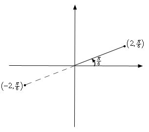 This is an xy-axis system with the point (2, $\frac{\pi}{6}$) shown in the 1st quadrant.  There is a line from the origin to this point and it is shown that the angle from the x-axis to this line is shown to be $\frac{\pi}{6}$.  The point (-2, $\frac{\pi}{6}$) is also shown and a dashed line from the origin to this point is included on the sketch.