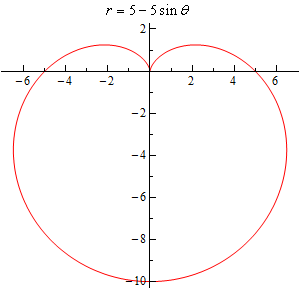 This is the graph of $r=5-5\sin \theta $ that goes through the points given in the table above.  It is a vaguely heart shaped graph that is symmetric about the y-axis.  The “crease” in the heart is at the origin and is in the 1st and 2nd quadrants.  The vast majority of the graph appears below the x-axis.