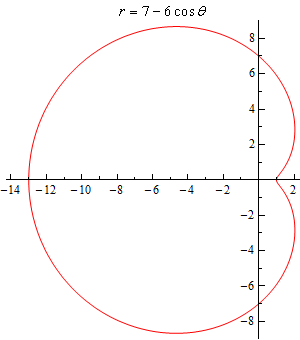 This is the graph of $r=7-6\cos \theta $ that goes through the points given in the table above.  It is a vaguely heart shaped graph that is symmetric about the x-axis.  The “crease” in the heart is at (1,0) and is in the 1st and 4th quadrants.  The vast majority of the graph appears to the left of the y-axis.