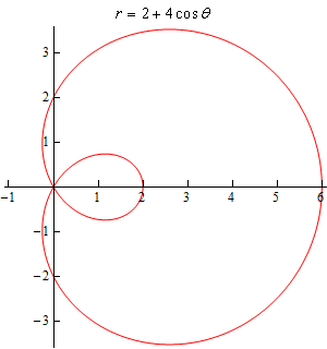 This is the graph of $r=2+4\cos \theta $ that goes through the points given in the table above.  It is a vaguely heart shaped graph (with one major difference to be discussed shortly) that is symmetric about the x-axis.  The “crease” in the heart is at the origin and is in the 2nd and 3rd quadrants.  The vast majority of the graph appears to the right of the y-axis.  The major difference mentioned above is that when the graph goes into the crease/origin in the 2nd quadrant it doesn’t just pop back out into the 3rd quadrant.  Instead when the graph goes into the crease/origin it continues through the origin into the 4th quadrant and then goes up through the point (2,0) and then loops around through the 1st quadrant and goes back out through the origin into the 3rd quadrant.  This forms what is usually called the inner loop of the graph.
