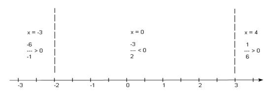 The solution to this inequality is \( - \infty < x < - 2\) and \(3 \le x < \infty \) OR \(( - \infty - 2)\)and \([3,\infty )\), depending on if you want inequality for the solution or intervals for the solution.