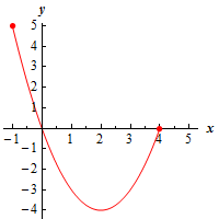 The point \(\left( {2, - 4} \right)\) is still both a relative minimum and an absolute minimum. There are still no relative maximums of the function on this interval. However, because we are now working on a closed interval (i.e. we are working on an interval with finite endpoints and we are including the endpoints) we can see that we have an absolute maximum that occurs at the points \(\left( {1, - 3} \right)\) and \(\left( {3, - 3} \right)\).