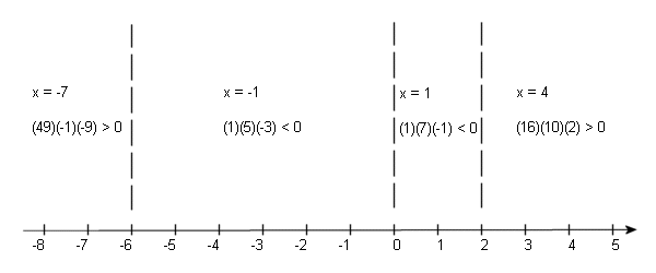 \[{x^4} + 4{x^3} - 12{x^2} \le 0\quad \Rightarrow \quad {x^2}\left( {{x^2} + 4x - 12} \right) \le 0\quad \Rightarrow \quad {x^2}\left( {x + 6} \right)\left( {x - 2} \right) \le 0\]In this case after factoring we can see that the left side will be zero at \(x = - 6\), \(x = 0\) and \(x = 2\).