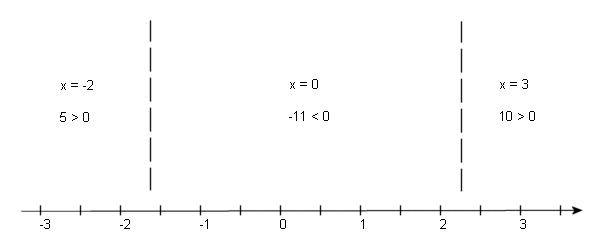 \[x = \frac{{1 \pm \sqrt {34} }}{3}\]Reducing to decimals this is \(x = 2.27698\) and \(x = - 1.61032\). From this point on it’s identical to the previous two problems. In the number line below the dashed lines are at the approximate values of the two numbers above and the inequalities show the value of the quadratic evaluated at the test points shown.