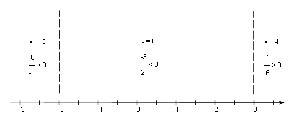 For this problem the numerator will be zero at \(x = 3\) and the denominator will be zero at \(x = - 2\). The number line, along with the tests is shown below.