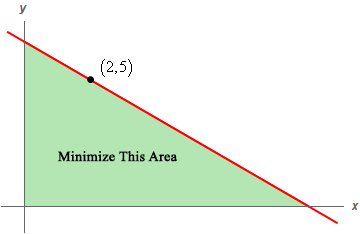 - A line through the point \(\left( {2,5} \right)\) forms a right triangle with the \(x\)-axis and \(y\)-axis in the 1st quadrant. Determine the equation of the line that will minimize the area of this triangle.