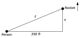 5. A person is standing 350 feet away from a model rocket that is fired straight up into the air at a rate of 15 ft/sec. At what rate is the distance between the person and the rocket increasing (a) 20 seconds after liftoff? (b) 1 minute after liftoff?