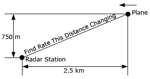 6. A plane is 750 meters in the air flying parallel to the ground at a speed of 100 m/s and is initially 2.5 kilometers away from a radar station. At what rate is the distance between the plane and the radar station changing (a) initially and (b) 30 seconds after it passes over the radar station?