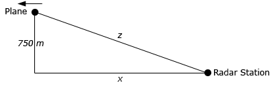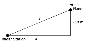 To finish off this problem all we need to do is determine both \(x\) and \(z\). For \(x\) we know the speed of the plane and the fact that it has flown for 30 seconds after passing over the radar station. So \(x\) is,
