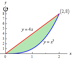 3. Use the method of cylinders to determine the volume of the solid obtained by rotating the region bounded by \(y = 4x\) and \(y = {x^3}\) about the \(y\)-axis. For this problem assume that \(x \ge 0\).
