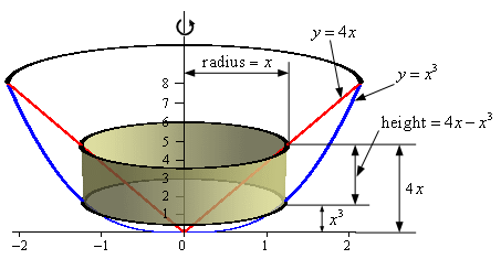 \[A\left( x \right) = 2\pi \left( {{\mbox{Radius}}} \right)\left( {{\mbox{Height}}} \right) = 2\pi \left( x \right)\left( {4x - {x^3}} \right) = 2\pi \left( {4{x^2} - {x^4}} \right)\] Show Step 4The final step is to then set up the integral for the volume and evaluate it.