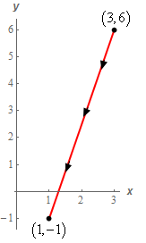 \[\vec r\left( t \right) = \left( {1 - t} \right)\left\langle {3,6} \right\rangle + t\left\langle {1, - 1} \right\rangle = \left\langle {3 - 2t,6 - 7t} \right\rangle \,\,\,\,\,\,\,\,0 \le t \le 1\]