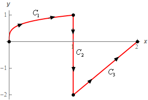 For \({C_2}\) we had to use the vector form for the line segment between two points instead of the equation for the line (which is much simpler of course) because the direction was in the decreasing \(y\) direction and the limits on our integral must be from smaller to larger. We could have used the fact from the notes that tells us how the line integrals for the two directions related to allow us to use the equation of the line if we’d wanted to. We decided to do it this way just for the practice of dealing with the vector form for the line segment and it’s not all that difficult to deal with the result and the limits are “nicer”.